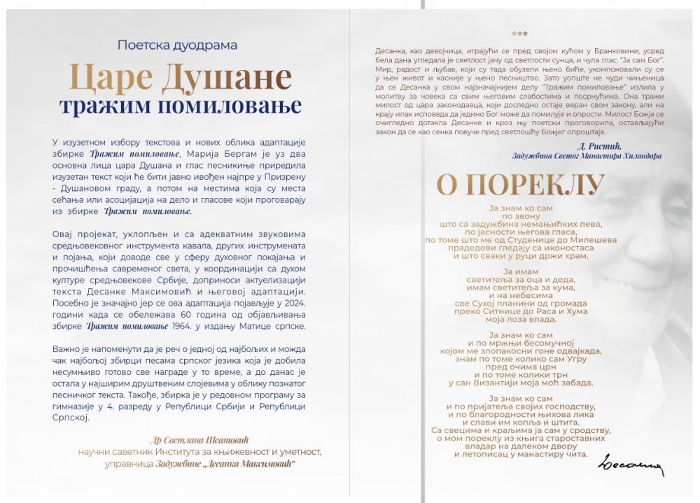 У аутентичном амбијенту атријума цркве Светог Спаса, у оквиру Спасовданских свечаности, Марија Бергам и Ђорђе Марковић, уз музичку пратњу Милоша Николића, успешно су одиграли ову поетску дуодраму, и на јединствен и нов начин донели пред публику раскошну и потресну поезију и дух наше славне песникиње Десанке Максимовић, обележавајући тако јубилеј 60 година од првог објављивања Десанкине збирке песама “Тражим помиловање” у издању Матице српске.